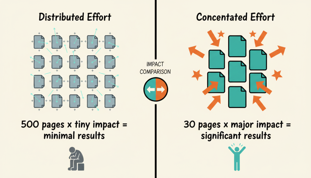 While your team exhausts itself rewriting hundreds of pages, focused competitors are optimizing their top 30 assets and seeing results. They move faster because they do less, but they do the right things.