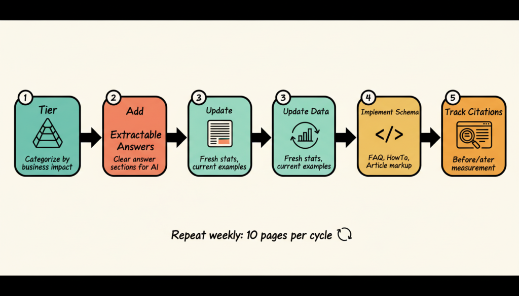 Add extractable answer sections to top pages. For each tier-one page, add a clearly formatted section that directly answers the primary question the page targets. Use a definition, a numbered process, or a comparison table. This makes your content easy for AI models to extract and cite.